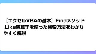はじめに エクセルVBA(Visual Basic for Applications)は、エクセルの作業を自動化するための強力なツールです。特に、データの検索や処理において、VBAの「Findメソッド」と「Like演算子」は非常に便利です。...