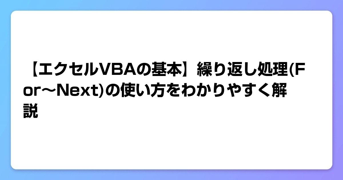 この記事では、エクセルVBAにおける繰り返し処理の基本であるFor~Next構文について学びました。重要なポイントを以下にまとめます。