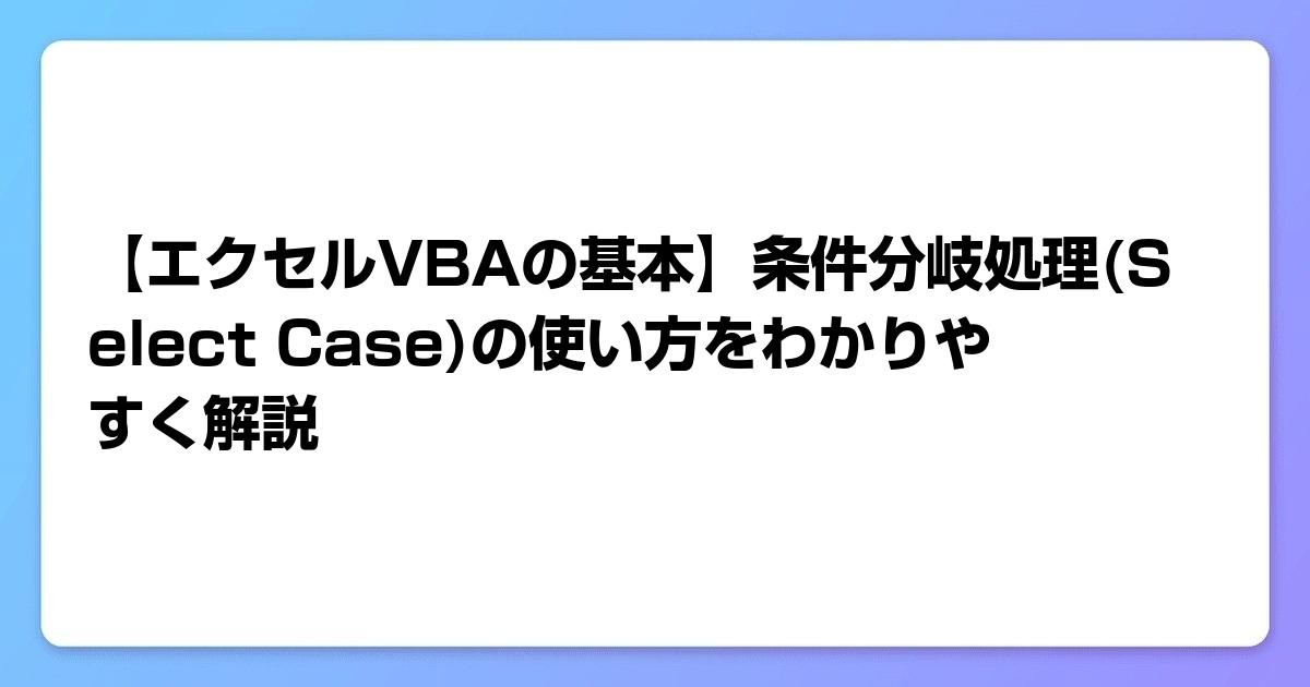 Select Case文は、複数の条件を簡潔に記述するための構文です。基本的な形式は以下の通りです: